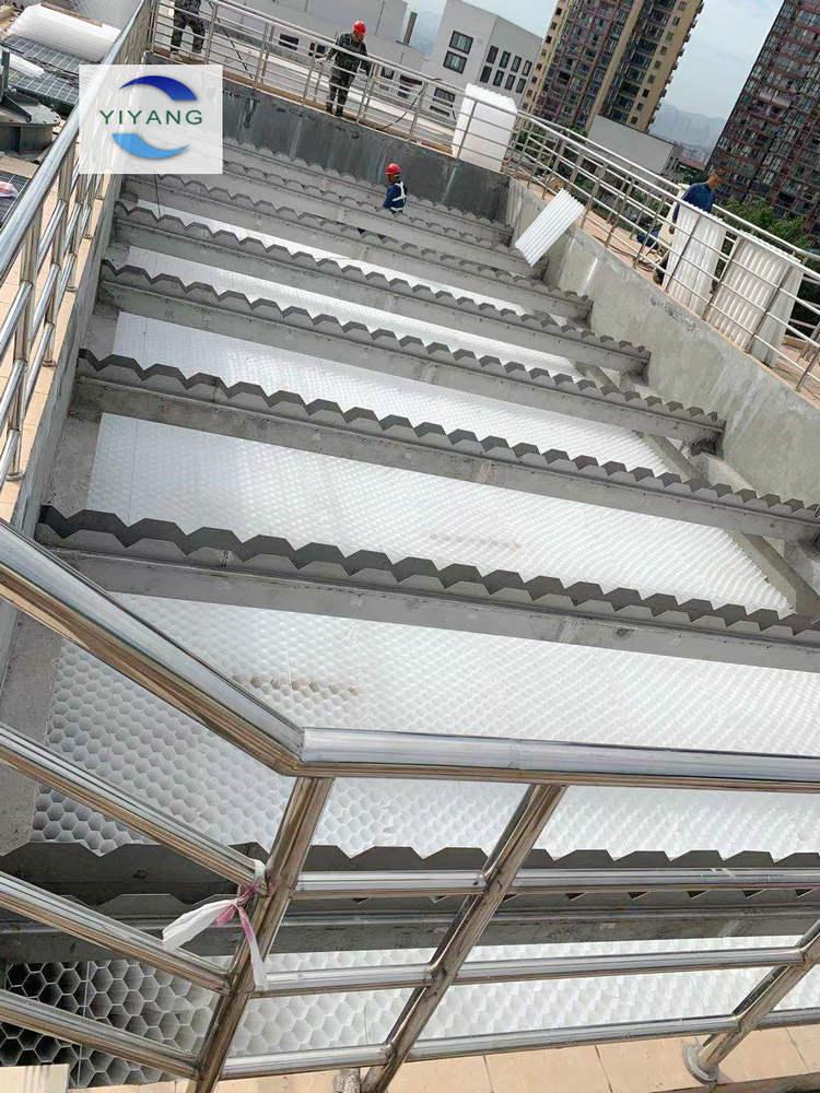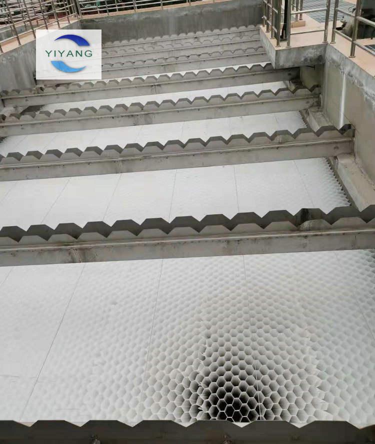 4、蜂窩斜管填料入池安裝:將所有焊接完畢的斜管填料運(yùn)到沉淀池內(nèi),開始從陰角按順序依次排開,接觸的焊接點(diǎn)用電烙鐵繼續(xù)焊接,保證斜管填料保持60°的角度不變。按順序組裝,適當(dāng)壓緊布置排列。